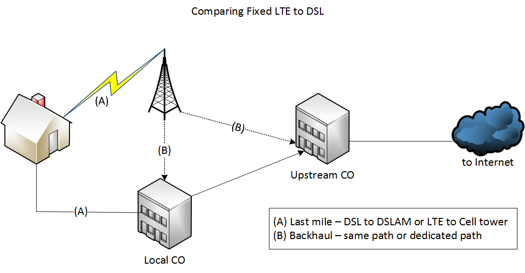 (A) simply illustrates the “last mile” difference between DSL and LTE service. The cell tower may be adjacent or co-located with your local central office, or not, which brings up (B). (B) illustrates the infrastructure options available to the telco. They could have it follow the data services that they already have provisioned for traditional LTE services, or they could offer separate backhaul that either goes to the local central office or is sent up to an upstream central office.