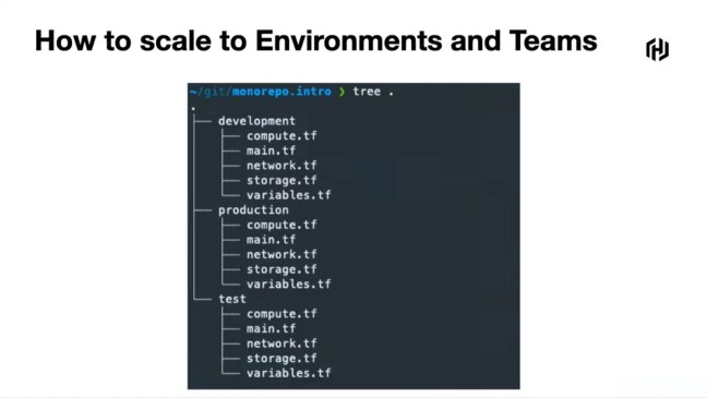 A Monorepo is a single repository that stores the source code for multiple environments, like Development, Staging, and Production. It was recently discussed in the Hashiconf Europe talk, “Using a Monorepo with Terraform Cloud”. Within the repo, it is organized with separate directories for each environment and the code is copied from one to the other.
