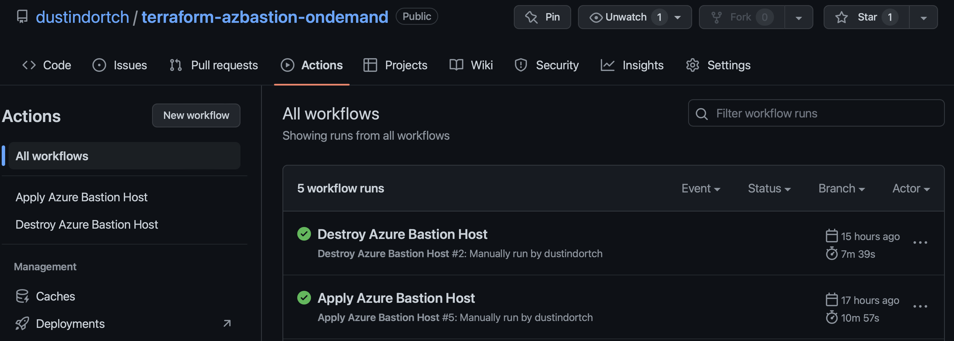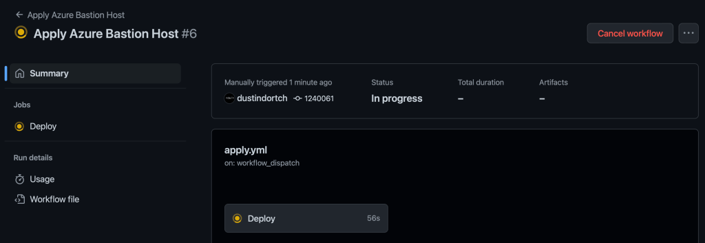 Now we’re able to go into the repo, click on “Actions”, and manually run the “Deploy” or “Destroy” workflows as needed. This is still too many steps for me because I am going to have to wait 10+ minutes for it to deploy.