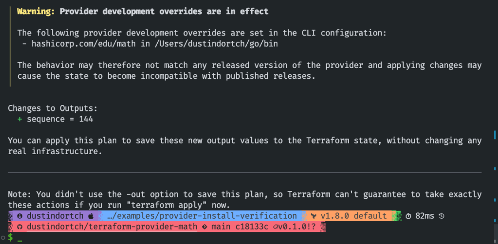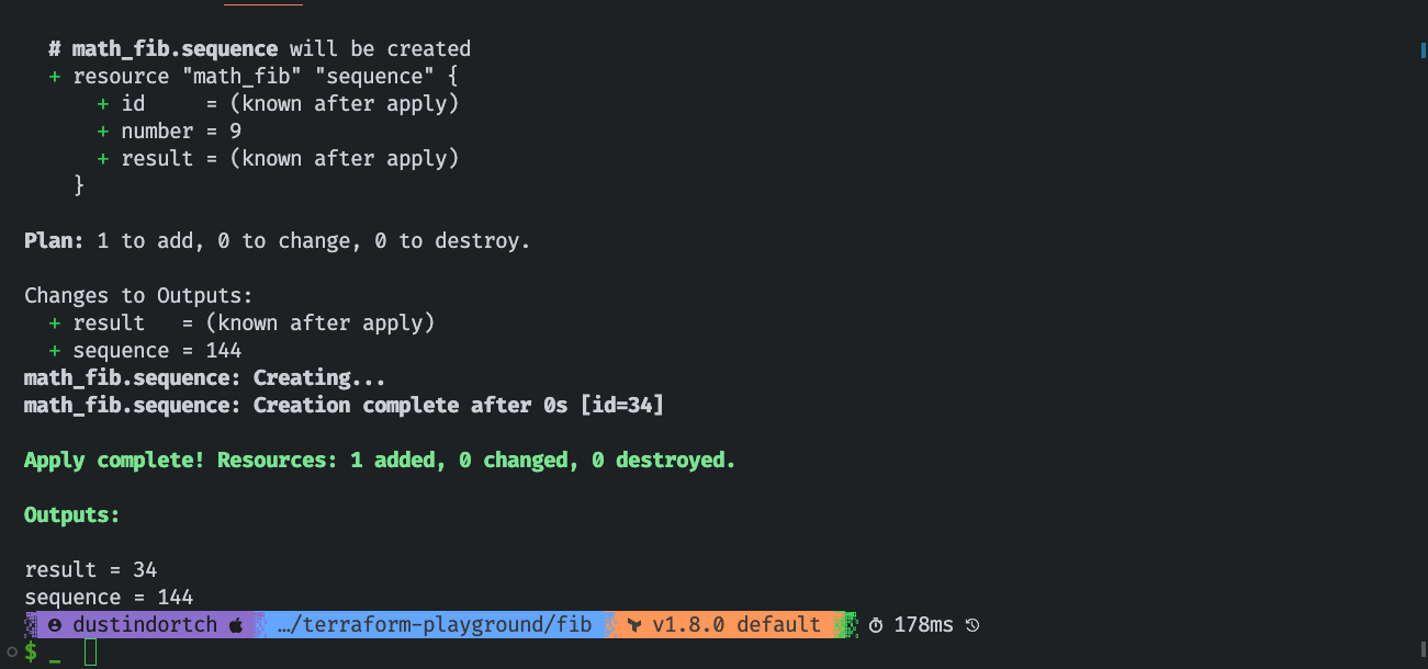 To contrast the behavior between functions and resources, I also implemented a resource called “math_fib” that uses the same “fib” pacakge. The main difference is that the resource is written to state and won’t update unless there is a change that requires it to be replaced. A function does not get [directly] written to state (only if it is the input to some other resource that is written to state).